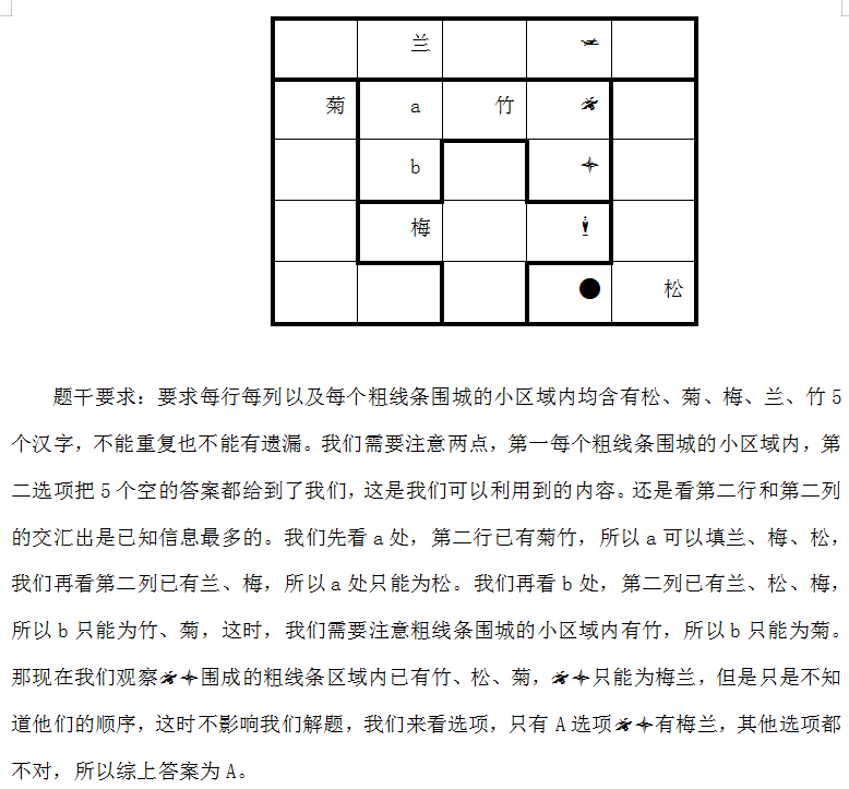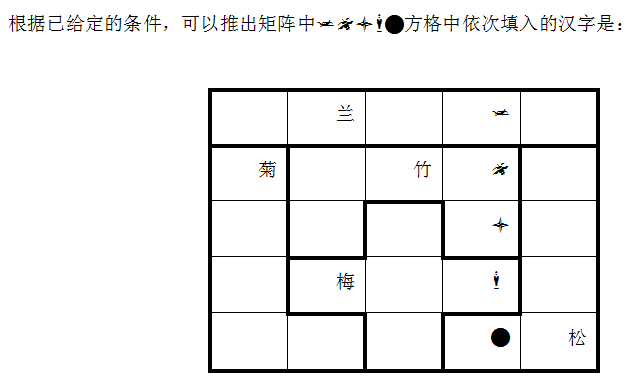 【例2】在下列5*5的正方形矩阵中,每个小方格可填入一个汉字。要求每行每列以及每个粗线条围城的小区域内均含有松、菊、梅、兰、竹5个汉字,不能重复也不能有遗漏。