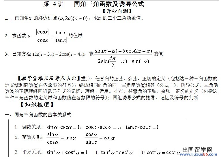 三角函数对于各位朋友应该是最熟悉不过,不知道大家还记得三角函数的计算公式吗?今天就让出国留学网给大家分享一下三角函数诱导公式基础知识,想知道的朋友们进来文章学习一下吧。