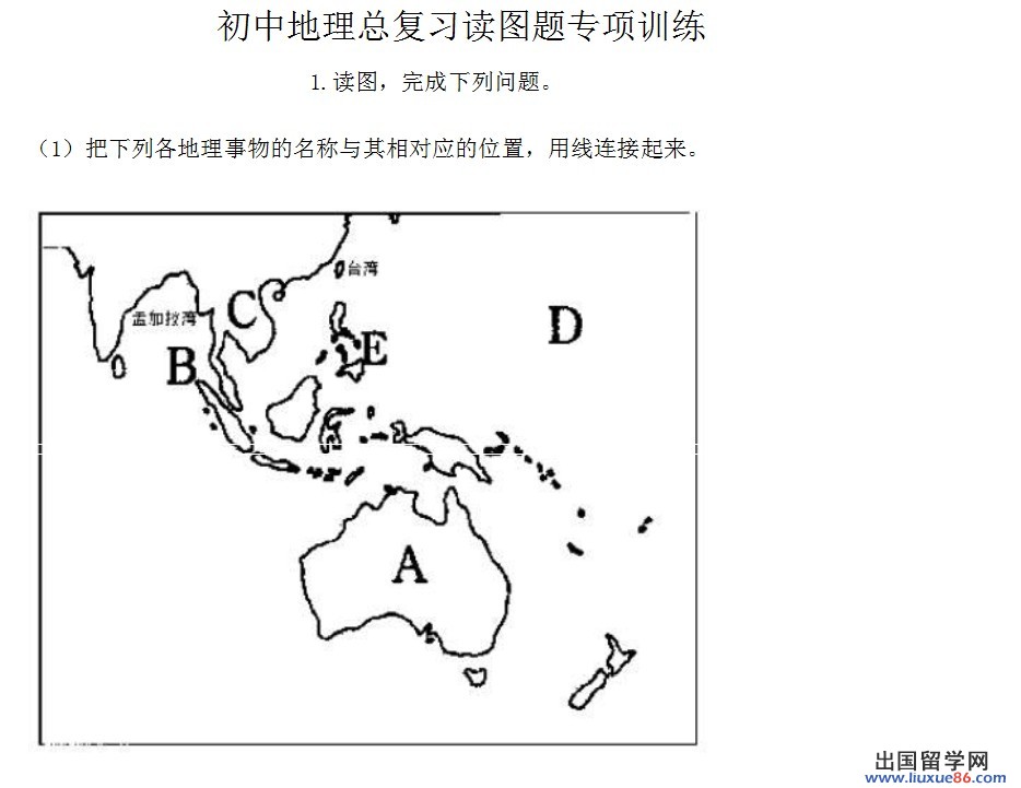 1、(1)A、大陆 B、海峡 C、半岛 D、大洋 E、岛屿 (2)太平洋马陆甲海峡 印度洋