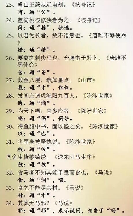 通假,即汉字的通用和假借,这是古汉语中特有的一种语言现象。课文注解中的“×同×”都是说前一个字是后一个字的通假字,也就是说前一个字应该按后一个字的读音来读,并且要按后一个字的词义来理解意思。