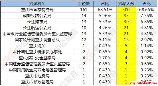 通过审核人数重庆市国家税务局占鳌头,同时重庆市国家税务局在本次国考重庆地区招录中,招录岗位及人数亦是最多。而通过审核人数第二的中国银行业监督管理委员会重庆监管局,招录人数在13个部门中位居第五,仅招录13个职位,21个人。