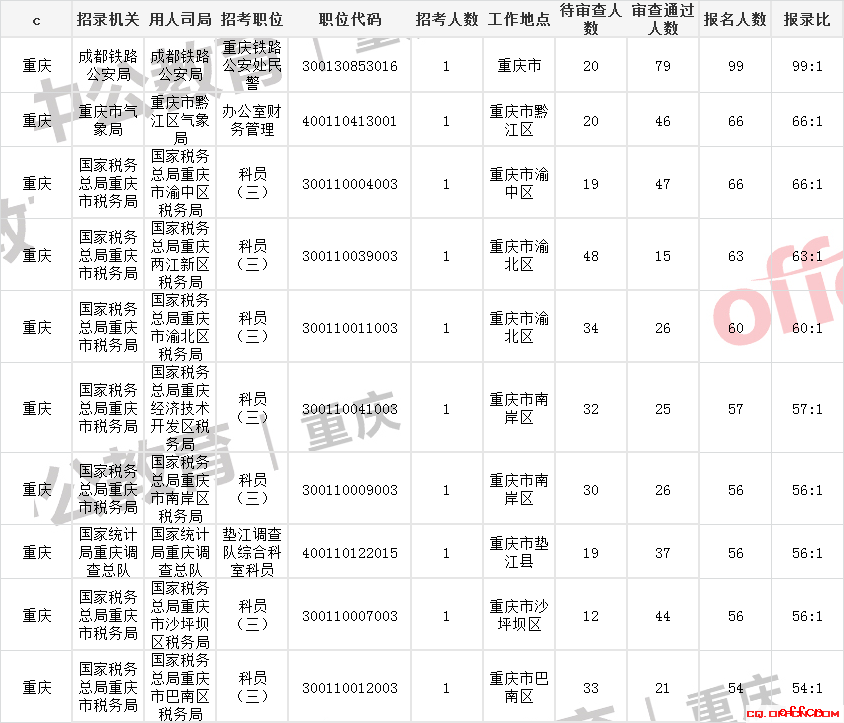 2019国家公务员考试报名第三天即将结束,目前重庆地区平均报录比为15.39:1,远低于“热门岗位”的报录比。成都铁路公安处民警的热度一直居高不下,虽然报名人数不是最多,但99:1的报录比远超报名人数第一的长江航运公安局-派出所科员三(报录比43.67:1),同时,它的报录比还远超排在第二的重庆市气象局-办公室财务管理,是名副其实的最受考生青睐的岗位。
