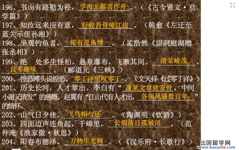 中考语文积累与运用是中考语文的基础题,所占分值一般为150分试卷的30分左右。内容主要包括拼音(有的是根据拼音写汉字,有的是给汉字注音),句子正误的判断,古诗文的识记与默写(提醒:不仅仅是古诗词,还有古典散文,如《岳阳楼记》《出师表》的名句默写等。更多有关2014中考语文的信息可登录出国留学网语文频道,欢迎收藏本站(CTRL+D即可收藏)!