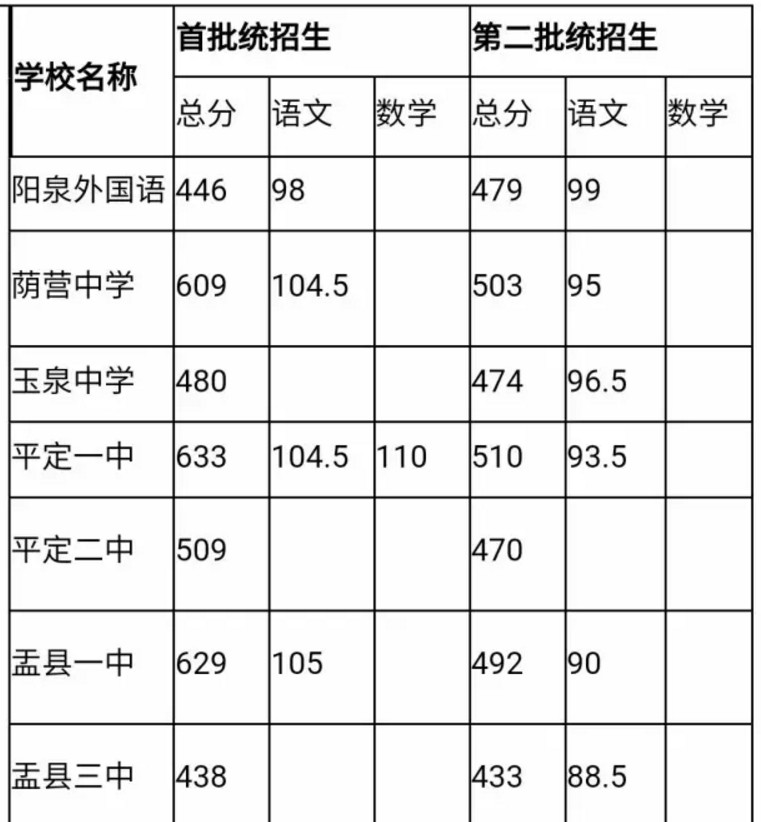 第二批:阳泉一中,城区553(语文100,数学97.5),其他县区573(指标生最低控制线);阳泉二中507(语文96);阳泉三中477(语文93);阳泉十一中528(语文104.5);阳泉十五中510(语文98.5);阳泉十七中454(语文93.5);阳泉市外国语学校479(语文99);荫营中学503(语文95);玉泉中学474(语文96.5);平定一中510(语文93.5);平定二中470;盂县一中492(语文90);盂县三中433(语文88.5)。