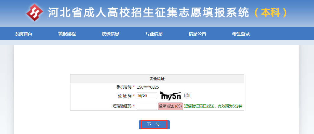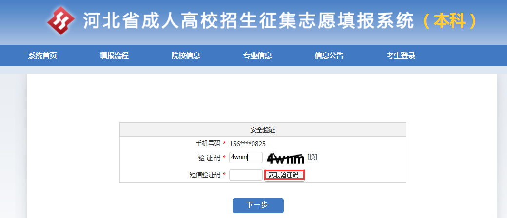 第四步:录入短信验证码(通过手机获取验证码),点击“下一步”按钮。