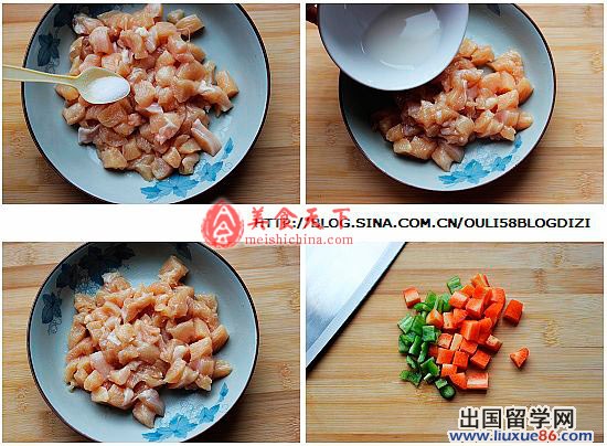 2、鸡丁要事先腌制才入味,加入一勺油和上浆的作用都是为了让鸡丁更滑嫩,少许白酒可以去腥提鲜。