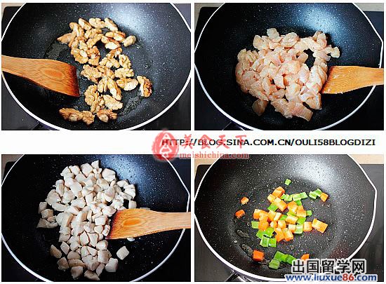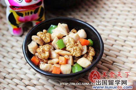 4、锅里放适量油,油热后将核桃放入,小火慢慢烤香,它然后铲出,将浆好的鸡丁放入锅里滑炒,直到鸡丁热色变白,肉质成熟即可铲出。
