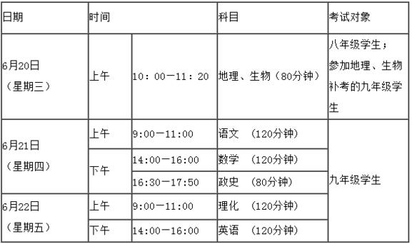 考试时间由两天调整为3天,八年级地理、生物6月19日上午10:30-11:20考试,考试时长80分钟;九年级仍然安排在20、21日两天考试,各科考试时长没有变化,但考试科目顺序进行了调整:数学由21日上午调整到20日下午14:00——16:00考试,理综由21日下午调整到21日上午考试,英语由20日下午调整到21日下午考试,语文仍然是6月20日上午考试,文综仍然是6月20日下午16:30——18:10考试。