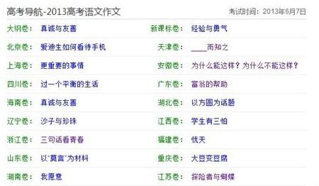 全国卷:真诚与友善;新课标卷:经验与勇气;北京:爱迪生怎么看手机;上海:更重要的事;广东:以"捐助"为题作文;四川:过一个平衡的生活;江苏:探险者与蝴蝶;湖南:走过;辽宁:沙子和珍珠;江西:学生有三怕;重庆:以大豆为题材写作。今年,山东的考题是以"莫言"为材料自拟标题进行作文写作,青岛二中特级语文老师郝敬宏认为,题目既有山东的地域特色又有时代特色: