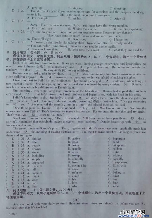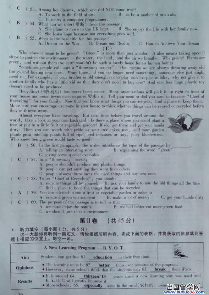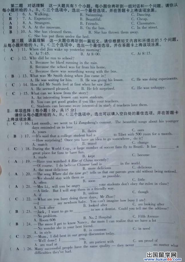 中考是一场没有硝烟的战争,考生们正在考场上奋斗,相信大家从考场上退下来的时候一定很想最快知道自己的成果吧,但中考成绩出来是需要一定时间的,所以大家可以先自己对照一下,出国留学网中考频道会及时为广大考生提供2014菏泽中考英语真题及答案,菏泽的考生们可以到本网站来下载对照答案,相信一定会对大家有所帮助,建议您收藏本网站(ctrl+D收藏即可)。