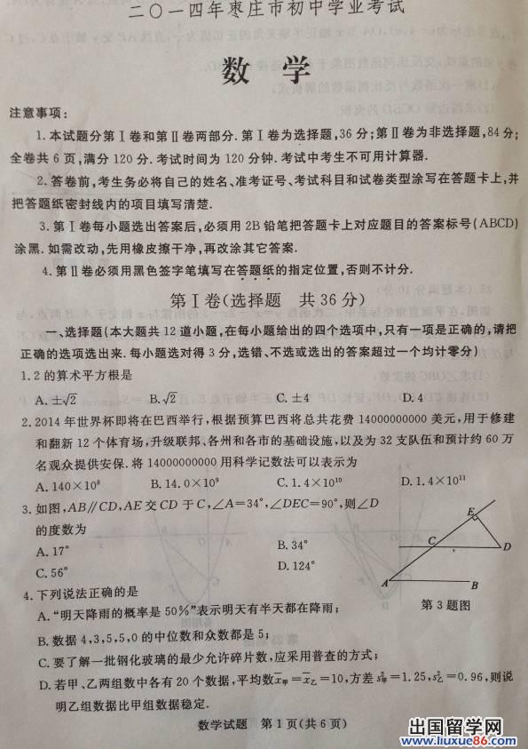 以下2014年枣庄中考数学真题及答案由出国留学网中考频道为您提供,希望对您有所帮助!
