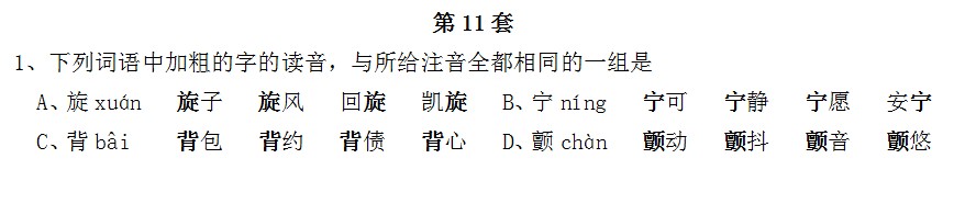 1.D(“旋子”、“旋风”中“旋”读xuàn:“宁可”、“宁愿”中“宁”读:nìng:“背债”的“背”读byi)