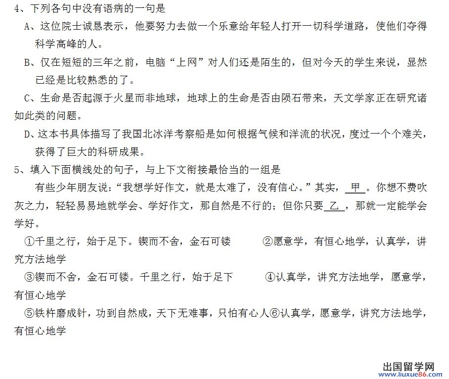 4.C(A“夺得”“科学高峰”,搭配不当。B主客颠倒,应为“人们对电脑上网”。D成分残缺。“描写”什么?应在“成果”后添加“壮举”之类的词语)