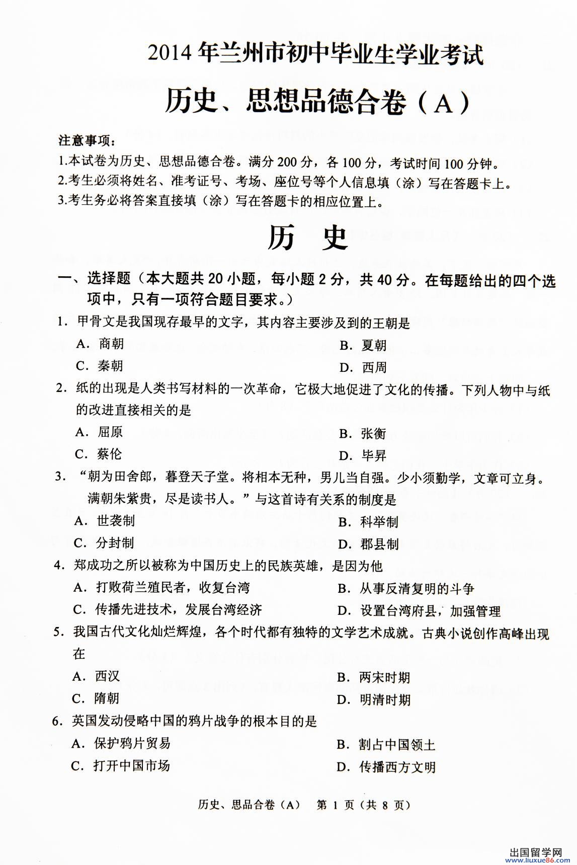 以下2014年兰州市中考文综真题及答案由出国留学网中考频道为您提供,希望对您有所帮助!