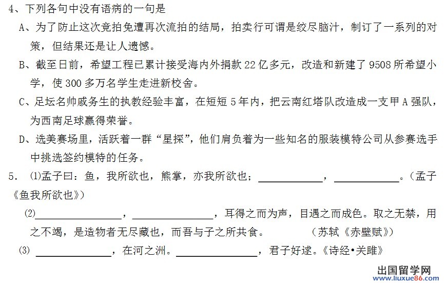 4 . B ( A“防止”“免遭”连用造成否定失当;C 暗中更换主语,可在“把”前加上主语“他”;D “为一些知名的服装模特公司”“从参赛选手中”,语序不当。)