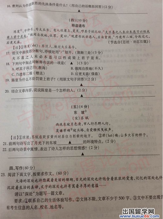 2014年的中考正在进行,相信此时的考生们正在考场里挥洒文墨,正怀抱着雄心壮志。出国留学网中考频道会及时为 广大考生提供2014宁波中考英语作文题目,出国留学网中考频道现在这里预祝大家考出自己满意的成绩。