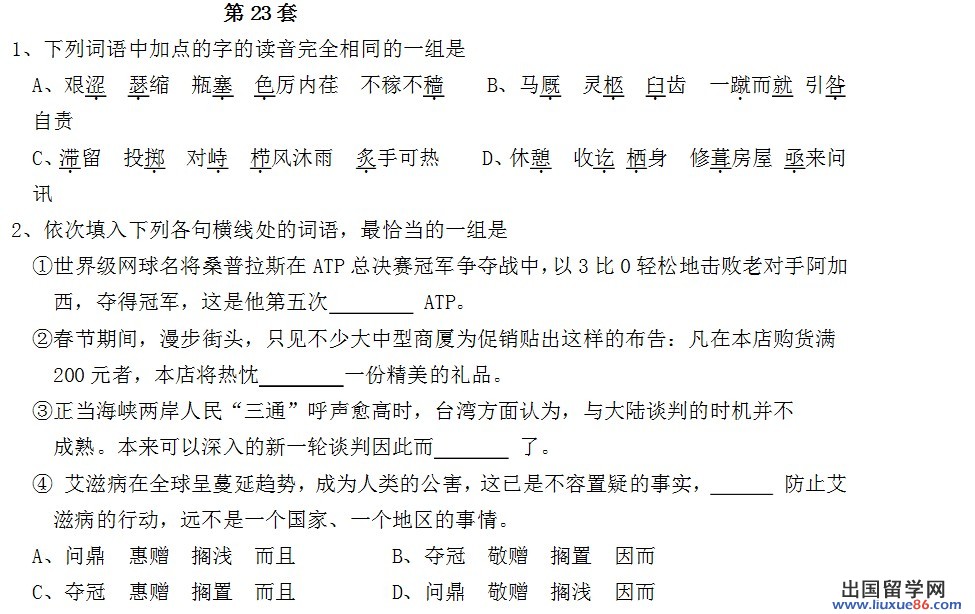 1、C ( C项都读zhì A项的“瓶塞”的“塞”读塞süi,其余的读sa;B项的“一蹴而就”的“蹴”读cù,其余的读jiù;D项的 “栖”读q?,其余的读qì。)