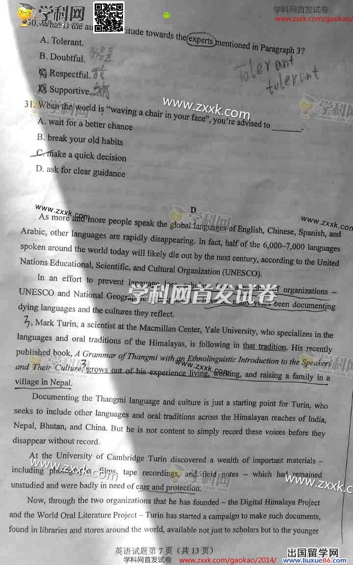出国留学网为您提供最权威的高考真题及答案信息,经过了连日来的忙碌,现在由出国留学网高考频道为您公布2014山西高考英语真题及答案,供您参考,希望对您有帮助,欢迎您访问出国留学网浏览更多高考真题信息,您还可以按按CTRL+D收藏本站。