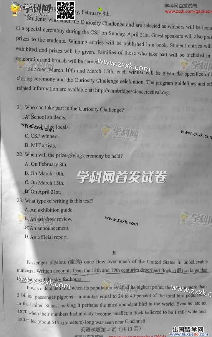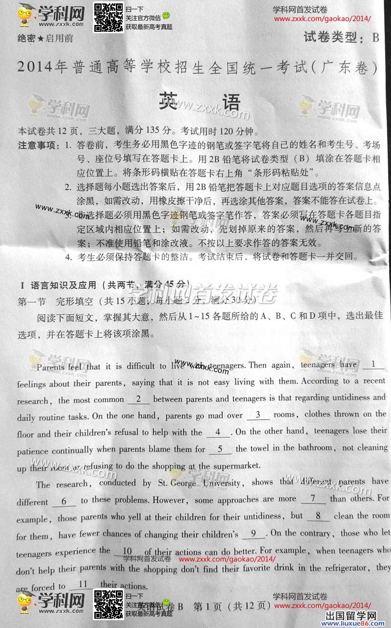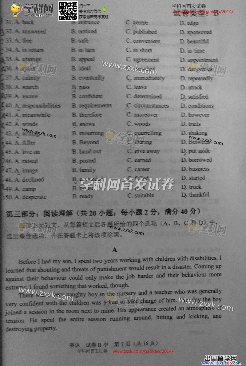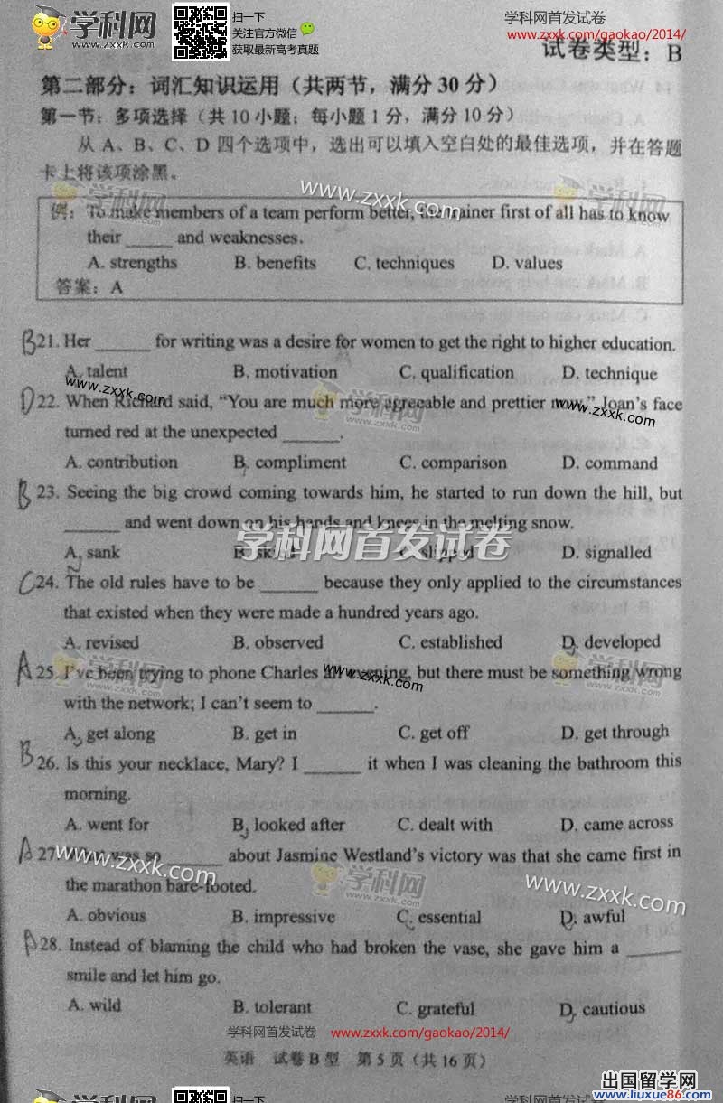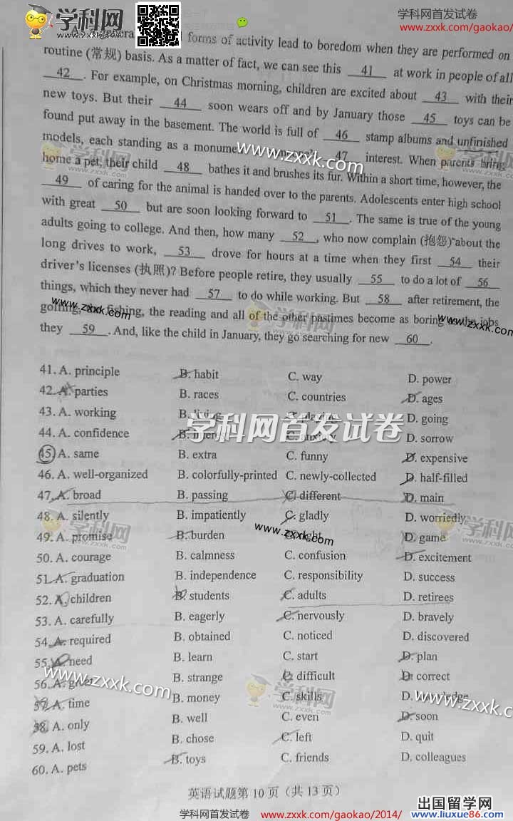 2014年的高考已经到来,出国留学网为您的高考之路保驾护航,青海高考频道考后为您首发2014青海高考英语试题以及参考答案,高考期间请您密切关注出国留学网高考频道,了解最新资讯您可以按CTRL+F5刷新页面,相信自己,您一定可以取得令人满意的成绩。