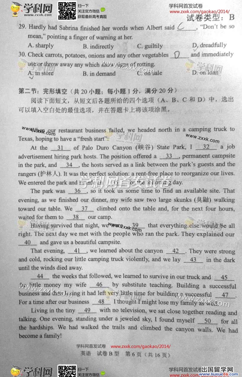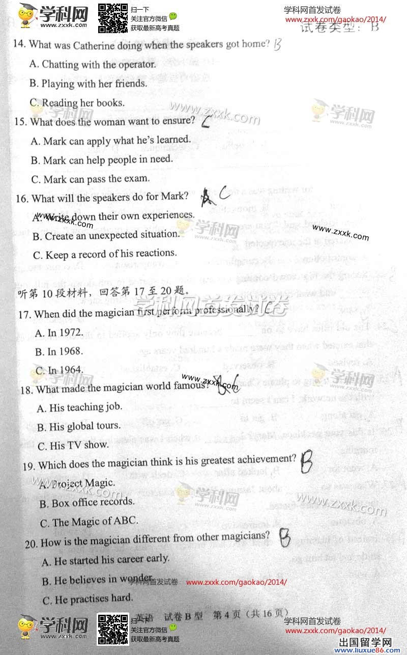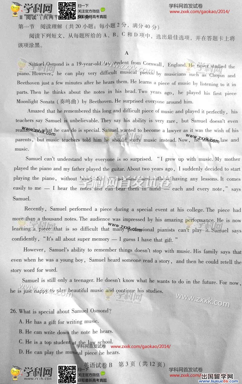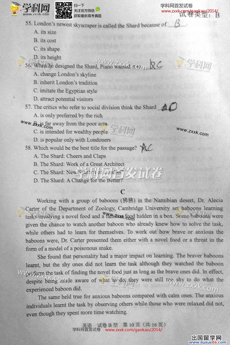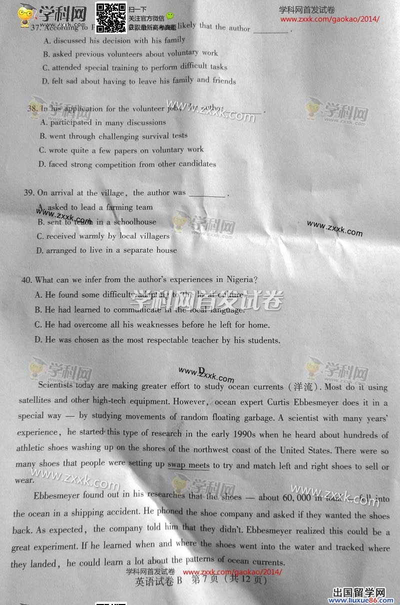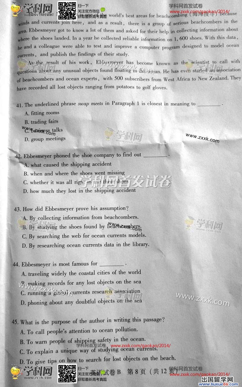 2014年的高考已经到来,出国留学网为您的高考之路保驾护航,青海高考频道考后为您首发2014青海高考英语试题以及参考答案,高考期间请您密切关注出国留学网高考频道,了解最新资讯您可以按CTRL+F5刷新页面,相信自己,您一定可以取得令人满意的成绩。