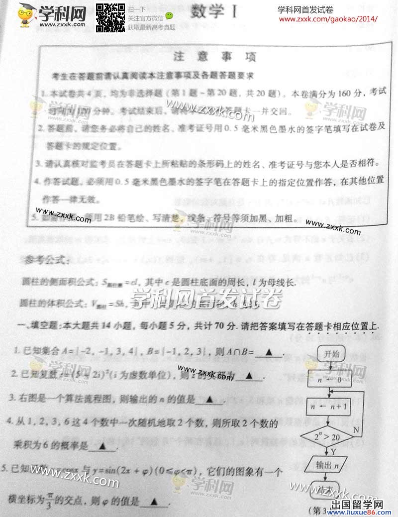 2014年的高考已经落下了帷幕,十年寒窗苦,朝暮读圣贤;学非单行道,之外路千条,心态摆平稳,从容去应考。江苏高考频道考后为您首发2014江苏高考数学试题,并为您附上详细的答案解析,一旦高考真题及答案发布,我们将会第一时间在此页面发布,希望考生及时关注。在此,出国留学网网小编提醒各位考生,无论自己考试这一关表现的怎么样,接下来的志愿填报也是一门很重要的“考试”,希望考生不要大意,加油!