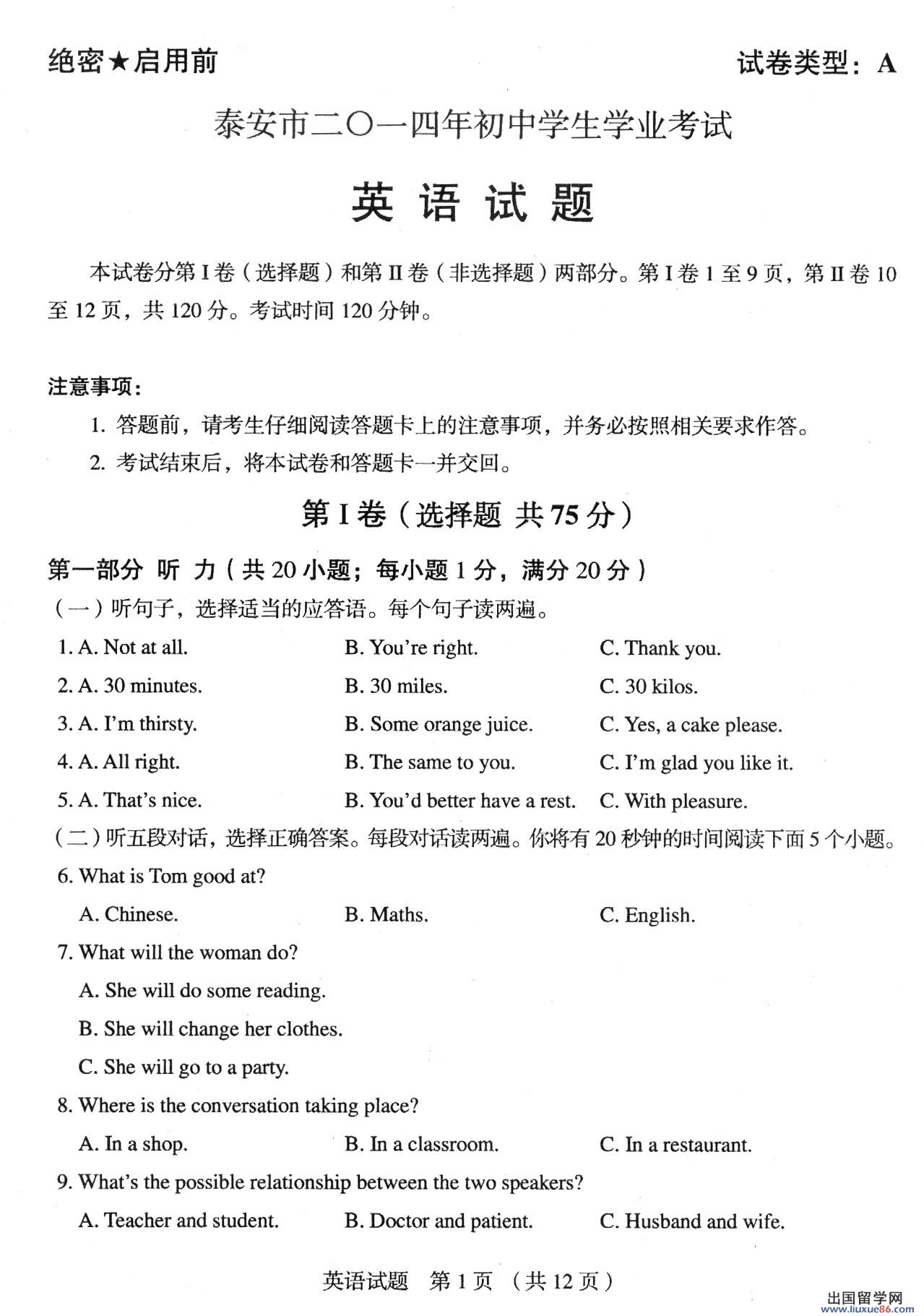 很多考生考前紧张到心都提到了嗓子眼,中考后又为某一题的答案夜不能寐,这都是不应该的行为,出国留学网中考频道小编第一时间为您提供2014泰安中考生物真题及答案解析,帮助大家分析考试中的利弊得失。