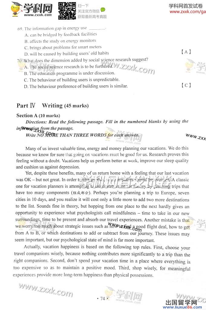 学习知识很重要,坚强性格更为好。高考不是独木桥,勤奋自信成大道。父母不要期盼高,孩子自觉最有效。状元经年量不少,今有几人能知晓。人生面临许多考,平和应对乐逍遥。愿今年参加高考的同学能以平和之心迎接考试。出国留学网高考频道第一时间为您提供2014湖南高考英语真题及答案解析,让全国各位考生更全面及时地了解高考最新相关信息资讯,懂的分析成败。