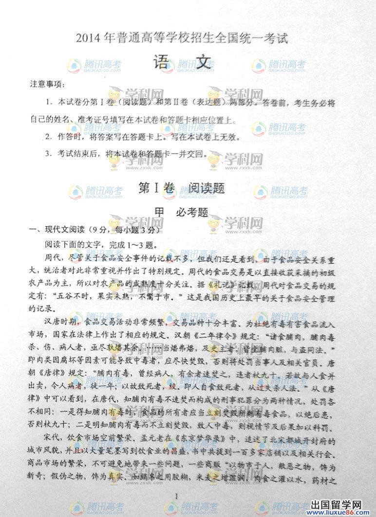 2014年的高考已经到来,出国留学网为您的高考之路保驾护航,甘肃高考频道考后为您首发2014甘肃高考语文真题(Word版),高考期间请您密切关注出国留学网高考频道,了解最新资讯您可以按CTRL+F5刷新页面,相信自己,您一定可以取得令人满意的成绩。