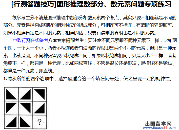 考试在即,我们的工作重点也要转向实战模拟了,出国留学网公务员频道(www.liuxue86.com/gongwuyuan)为大家提供了很多行测练习题以及答案解析,答题技巧等,并对类似题型进行归纳总结,帮助您总结答题技巧。
