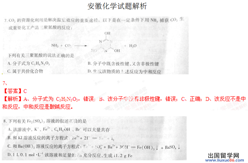 出国留学网高考频道为您提供2014年安徽高考理综答案(化学部分),希望对您考后估分有所帮助!