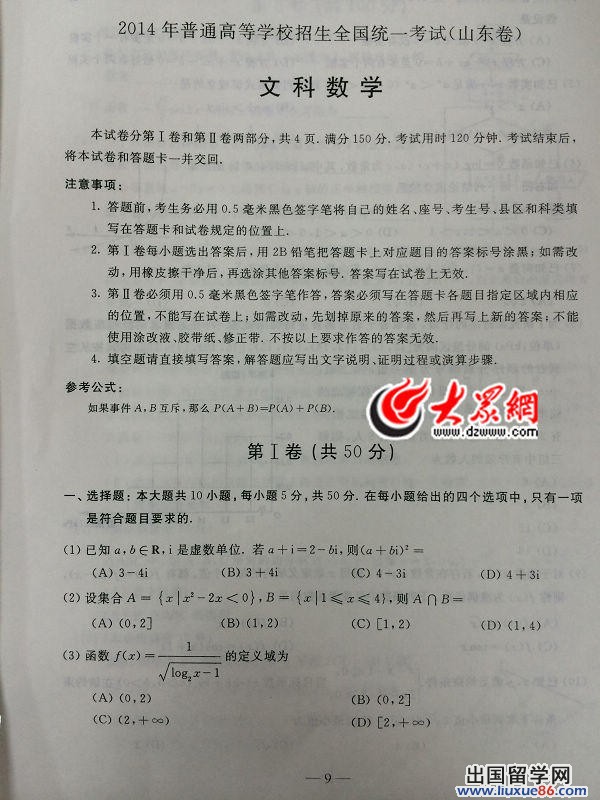 在充满激情、充满希望的六月,高考开始了。出国留学网高考频道第一时间为您提供2014山东高考文科数学真题及答案解析,方便所有考生更了解高考动向,了解自己的考试成绩。
