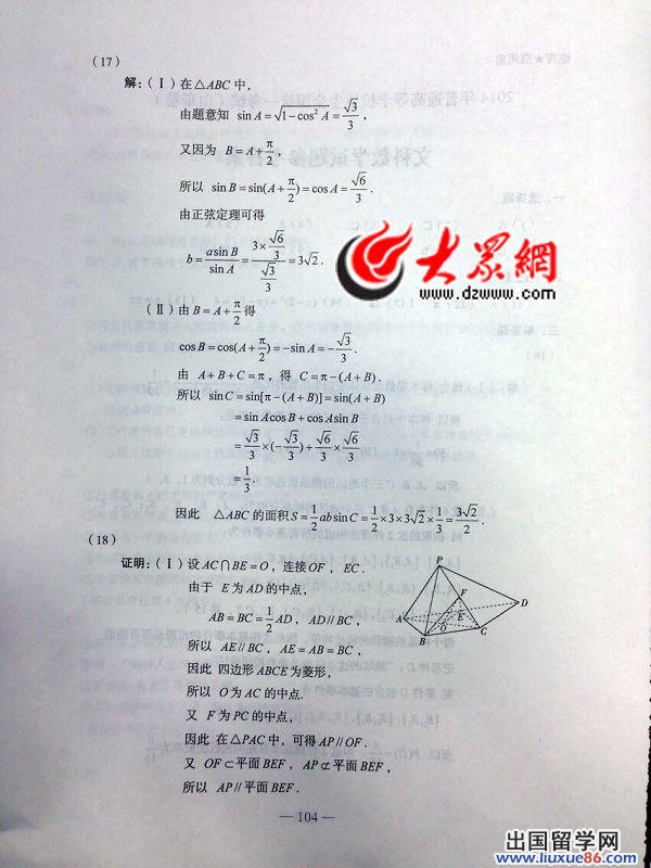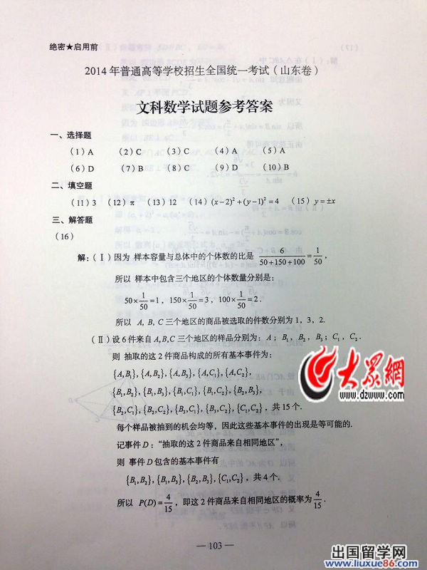2014年高考虽然已经结束了,但是它已经深深的印在了大家的心里,成为最宝贵的记忆被储存,为了大家能够更好的估分,出国留学网高考频道为您首发2014山东高考数学真题及答案已公布(文科),我们还将发布最新其他科目的答案,请大家一定要密切关注本网站。