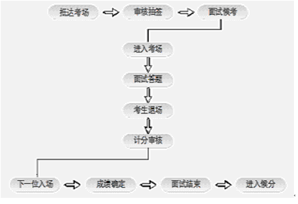 考生进入考场后,直接走到考生席,站定后向考官问好,得到“请坐”的指令后,考生可以落座。落座后,考生一般需要报自己的考试顺序号,等考官宣布导入语后,考试开始。要特别注意,考生不能自报姓名,如在考场内自报姓名,考生会被当场取消面试资格。