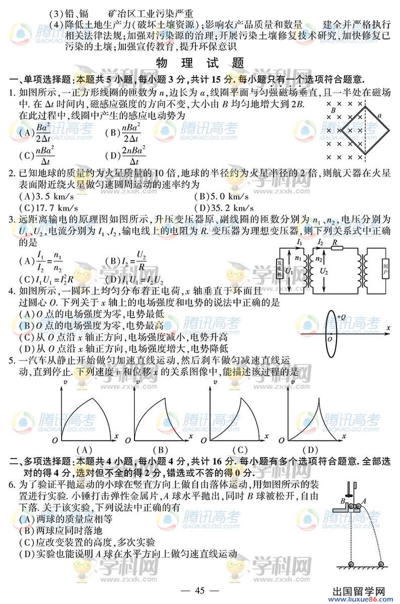 眉毛上的汗水和眉毛下的泪水你必须选择一样!三年的勤奋苦读在高考这个战场上不一定全面能体现出来,付出和努力的过程将成为每个经历高考的人之后人生和工作中难忘的一段经历。高考结束,,出国留学网小编在2014江苏高考结束后,将以最快的速度把2014江苏高考理综真题及答案公布并展示在本页面,方便广大考生和家长查询了解,理性分析成败。