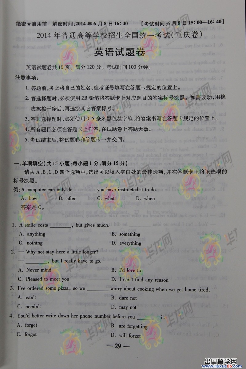 高考的青春,激情满怀的年华。小编愿考生们能抓紧青春,播种希望,2014年高考已经落下帷幕,大家一定很关心自己发挥的好不好,出国留学网高考频道为您首发2014年重庆高考英语真题及答案让同学们更好的估分。还有跟更多高考资讯尽在本网站,期待您的关注。