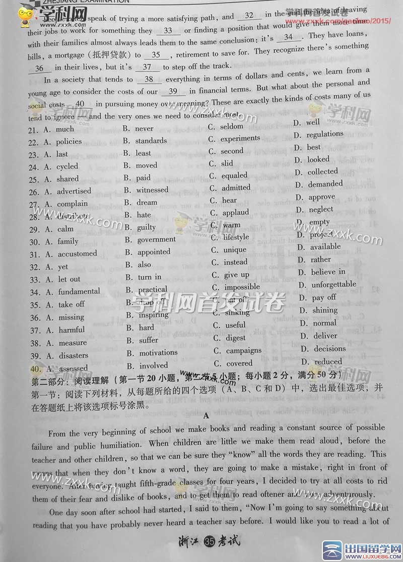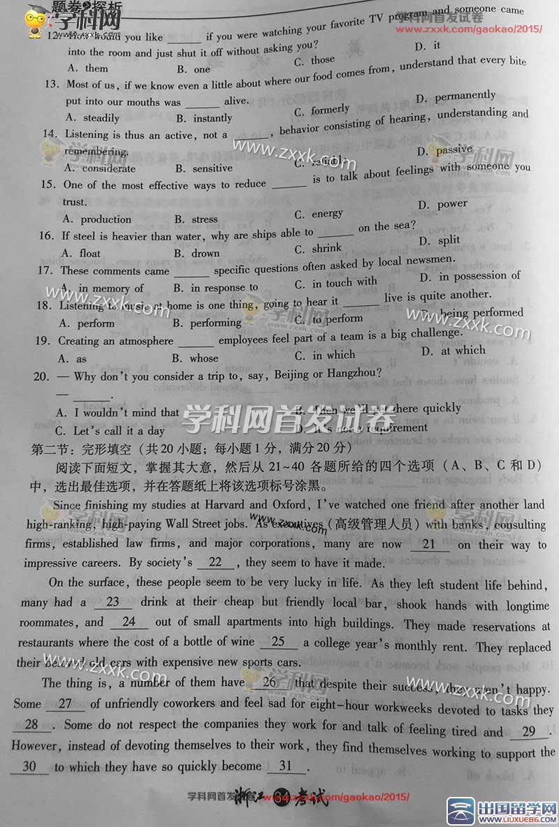 2015高考的大幕已经拉上,在您高考之后大学的校门将为您开启,您的高考成绩将直接关系着您就读什么样的学校,所以你一定要尽自己所能考出最好的成绩,出国留学网高考频道会及时为广大考生提供2015年浙江高考英语真题及答案,请您密切关注,我们会为您及时更新最新信息,请您收藏本站!!!