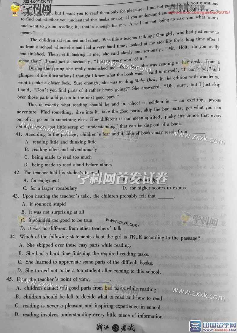 你有你的赤橙黄绿,我有我的青蓝靛紫,天空同属于我们,因为我们年轻。出国留学网高考频道会及时为广大考生提供2015年浙江高考英语真题及答案,请密切关注。若您需要的信息没有及时更新,请按ctrl+F5进行刷新。