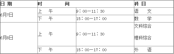 全国统考于6月7日至8日举行。各科目考试时间如下: