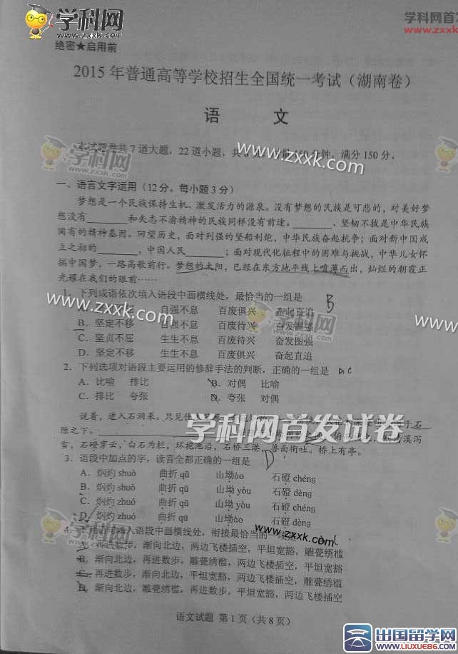 2015年的高考就这样华丽丽的结束了,不知道同学们发挥的如何,湖南高考频道考后为您首发2015湖南高考语文试题及答案,并附参考答案,以便您根据试题进行估分,这样也有利于高考志愿的填报,如果您在浏览本站的时候没有找到最新信息,请按CTRL+F5刷新,出国留学网小编预祝您金榜题名。