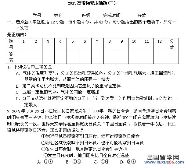 为了让马上就要进入高三的学生更好的复习,出国留学网小编为大家整理了2015高考物理压轴题试卷,希望给大家带来帮助,更多精彩内容欢迎访问www.liuxue86.com。
