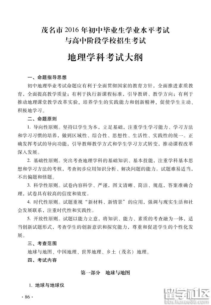 出国留学网茂名中考网为大家提供茂名2016中考地理考试大纲,更多茂名中考语文、茂名中考数学、茂名中考英语、茂名中考真题、茂名中考答案、茂名中考满分作文、茂名中考成绩查询、茂名中考分数线、茂名中考录取查询等中考信息请关注我们网站的更新!