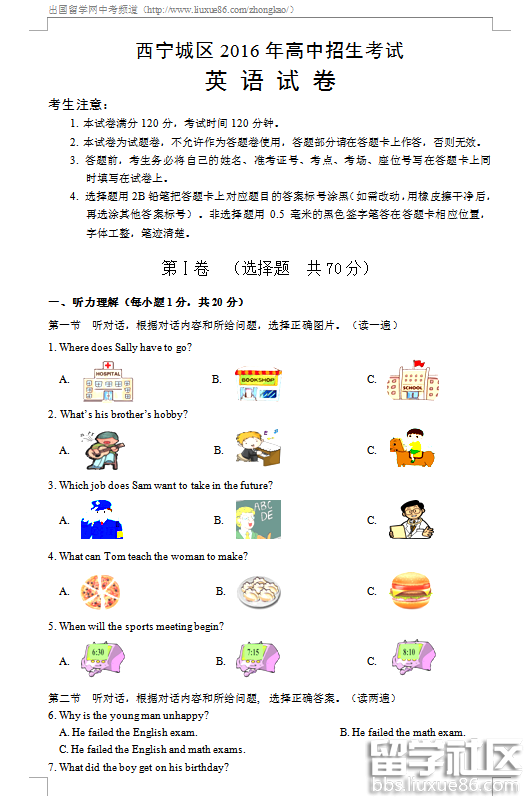 奋斗百日,绝不偷懒。出国留学网中考频道第一时间为您公布2016西宁中考英语真题及答案,希望对您有所帮助,欢迎您访问出国留学网查看更多中考资讯,了解最新信息请按CTRL F5刷新页面。更多西宁中考分数线、西宁中考成绩查询、西宁中考志愿填报、西宁中考录取查询信息等信息请关注我们网站的更新!