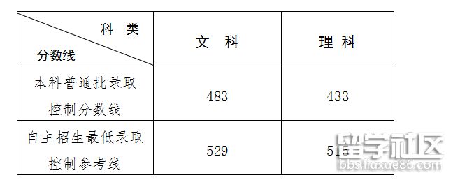 3.高水平运动员文化录取控制分数线:文科483分、理科433 分。其中在教育部“阳光高考”平台公示可享受本科普通批录取控制分数线65%优惠分值的考生,分别按文科313分、理科281分执行。