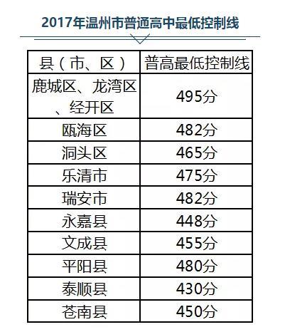 今年鹿城区、龙湾区(含经开区)的普高最低控制线为495分,瓯海区普高最低控制线为482分,洞头区普高最低控制线为465分。根据规定全市所有普通高中不能招收生源地普高最低控制线下考生,否则不能建立普高学籍。