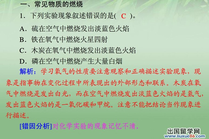 常见的化学反应是必须牢记的,要会默写,条件(加热、光照、催化剂),箭头(可逆,不可逆)都需要注意,反应过程的现象就不用说了,重要的都得记住。化学中的公式,就像记数学公式那样把它理解,记住,融会贯通,灵活运用,注意变通,别当书呆子。更多有关2014中考化学的信息可登录出国留学网化学频道,欢迎收藏本站(CTRL+D即可收藏)!