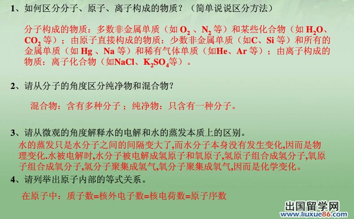 同学们复习《构成物质的微粒》时要注意重难点:1.认识物质的微粒性,知道分子、原子、离子等都是构成物质的微粒。2.能用微粒的观点解释某些常见的现象。3.能从微观的角度对物质进行分类,知道常见物质的微观构成。4.知道、分子、离子之间的区别和联系★5.知道原子是由原子核和核外电子构成的,原子核一般是由质子和中子构成的。知道原子中质子数、核电荷数与核外电子数的关系。6.从微观角度认识物理变化和化学变化的本质区别。更多有关2014中考化学的信息可登录出国留学网化学频道,欢迎收藏本站(CTRL+D即可收藏)!