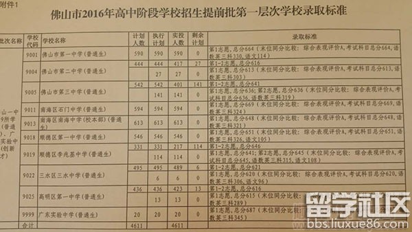 2016年佛山市高中阶段学校招生提前批最低录取控制分数线及学校录取标准如下: