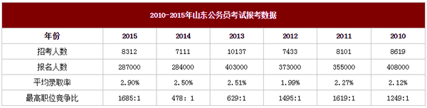 查看下表,近五年山东公务员考试招录人数起伏不定,总体呈下降趋势,平均录取率整体水平提高。这是不是就意味着考生成功考上公务员的几率变大了呢?其实也不然,考生是否能一举成“公”,最终主要还是看考生的实力与水平,同一报考职位的竞争比也有一定的影响。如2015年山东公务员考试最高职位竞争比为1685:1,创历年新高。该职位为济南市市中区教育局综合管理岗位,计划招录1人,主要从事机关教育管理相关工作,报考条件除了要求具有大学本科及以上学历,其余条件不限,综合对比报考门槛较低,大部分考生均可报考。如果考生不慎报考了这样的职位,平均录取率再高,你的成功概率也是1/1685。因此,考生除了要备考提升自身水平外,理性报考慎重选择报考职位,也是降低报考难度的重要因素之一。