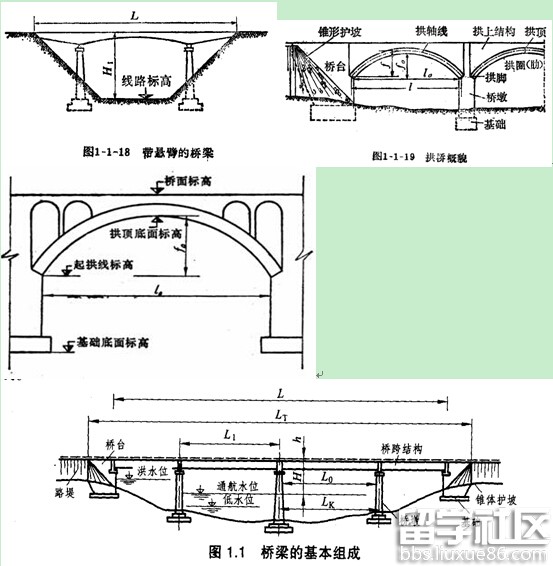 1、梁式桥净跨径是设计洪水位上相邻两个桥墩(或桥台)之间的净距,用L表示。对于拱式桥是每孔拱跨两个拱脚截面最低点之间的水平距离。