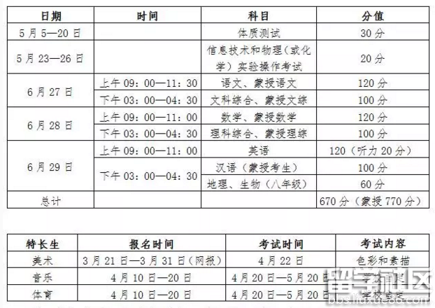 实验操作技能、信息技术考试时间为5月24—27日,体育测试时间为5月5—20日,测试共3项:男生1000米跑,女生800米跑;立定跳远;男生掷实心球(2kg),女生1分钟仰卧起坐。体育测试折合分值为30分,计入中考总分。普通考生总分总计670分,蒙授考生总分770分。